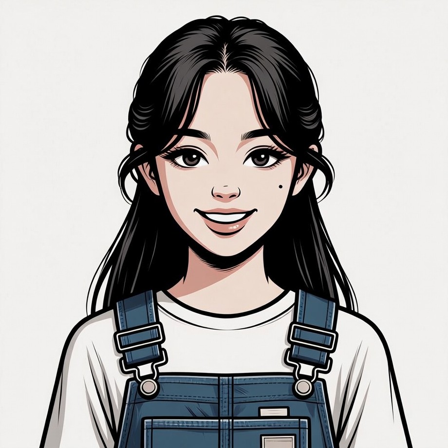 A young Asian woman with long black hair styled in a ponytail smiles warmly at the viewer. She wears a white t-shirt under blue denim overalls with straps over her shoulders. The illustration features her against a plain white background with clean line art and vibrant shading.