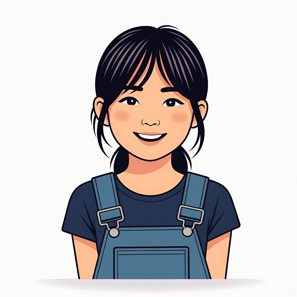 A cartoon illustration of a young Asian girl with long black hair tied back and rosy cheeks smiles happily at the viewer. She wears a blue denim overall dress over a black t-shirt with silver buckles. The image features a clean white background with subtle shadows.