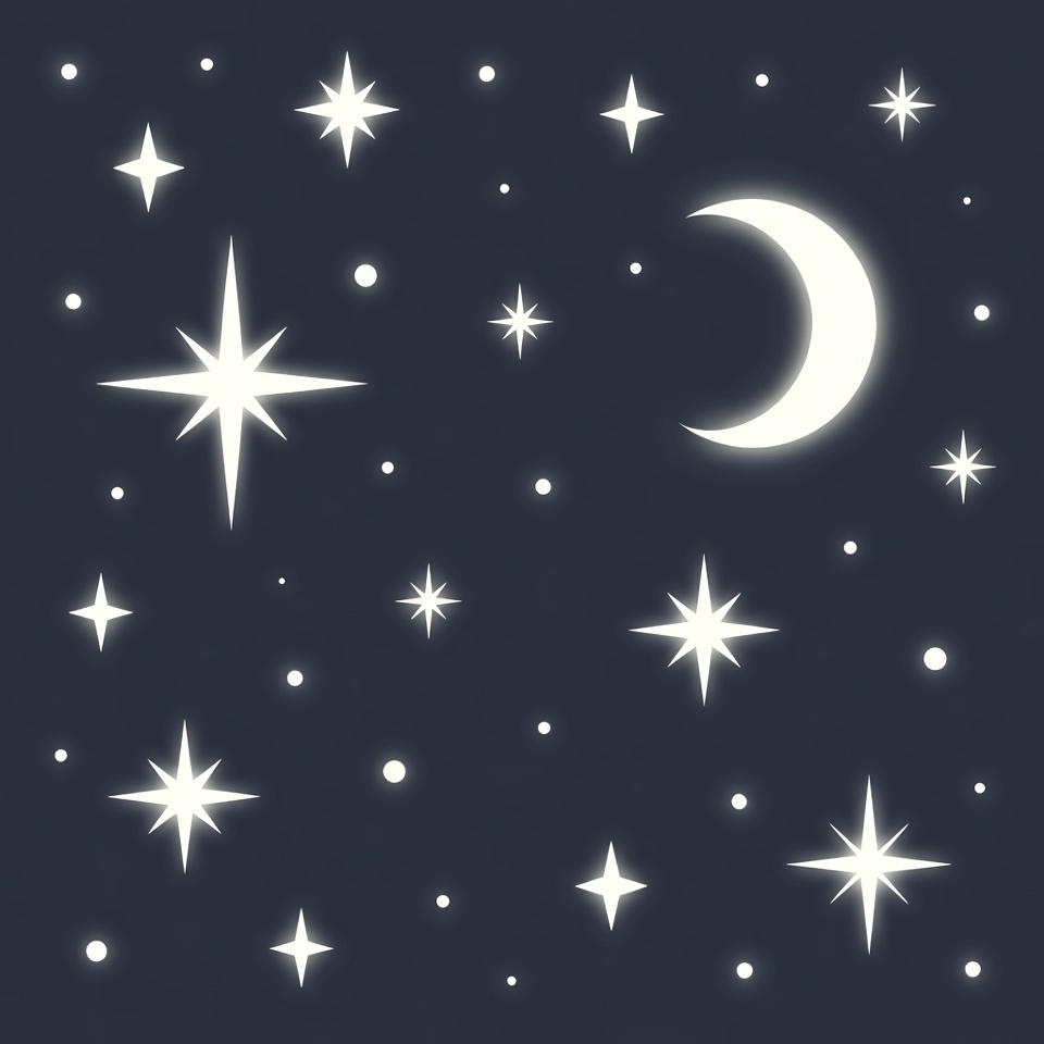 A dark navy background features numerous glowing white stars of varying sizes scattered across it. A prominent white crescent moon is positioned towards the right side. The design has a simple, illustrative style with an isolated background.