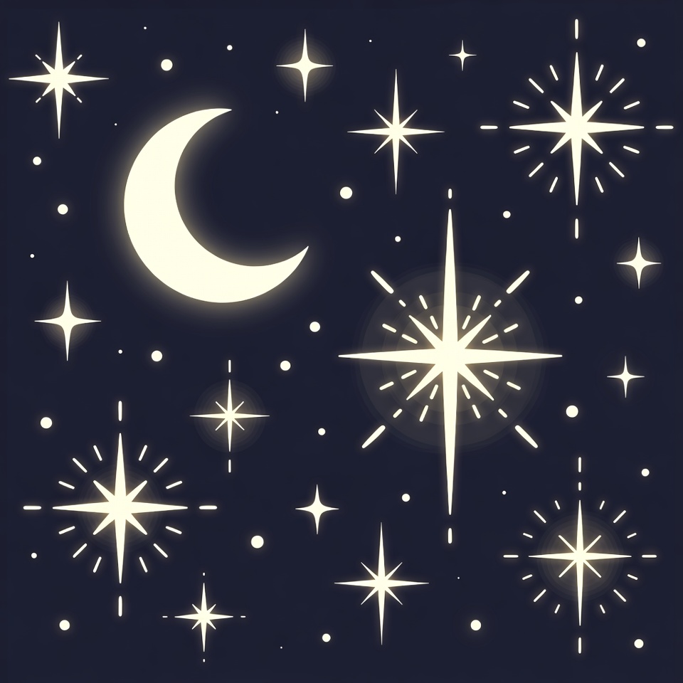 astronomy, celestial, clipart, cosmic, dark background, glowing moon, illustration, lunar, moon graphic, moon stars, navy background, night sky, radiant stars, sky illustration, space art, sparkle, star pattern, starry sky, stars, twinkling stars, white stars, crescent moon