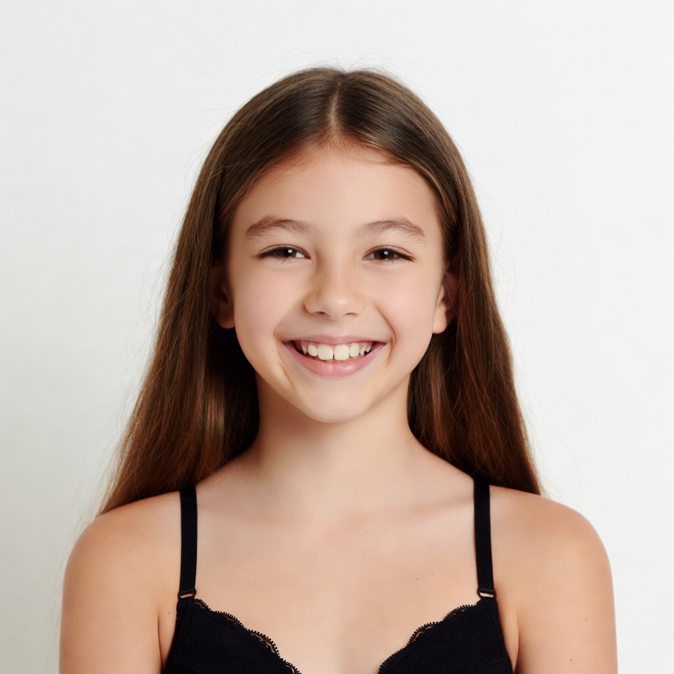 A young girl with long straight brown hair smiles happily at the camera against a white background. She has straight bangs and wears a black lace bra with thin straps. Her expression shows teeth in a bright smile.