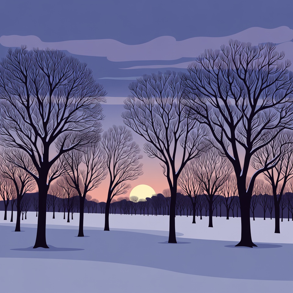 Flat illustration of bare trees silhouetted against a purple and pink sunset sky. A large sun glows orange near the horizon over a snowy field. Dark trunks and branches stand in crisp white snow.