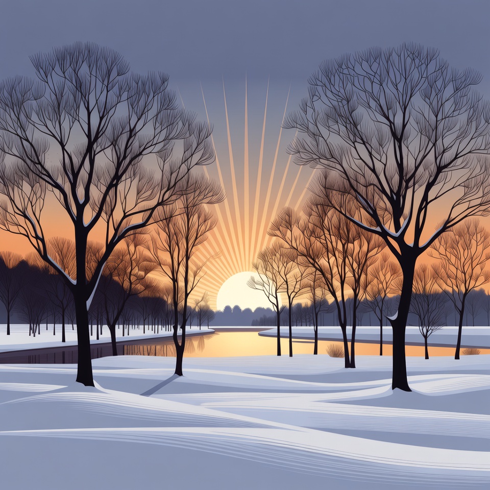 bare trees, blue tones, calm vista, cold weather, dawn dusk, digital art, frosty trees, frozen water, golden sunset, graphic illustration, icy river, nature illustration, orange hues, outdoor winter, peaceful nature, river, serene landscape, snow scene, snowy field, snowy landscape, sun rays, sunset reflection, tree silhouettes, twilight sky, vector art, winter scenery, winter trees, winter sunset