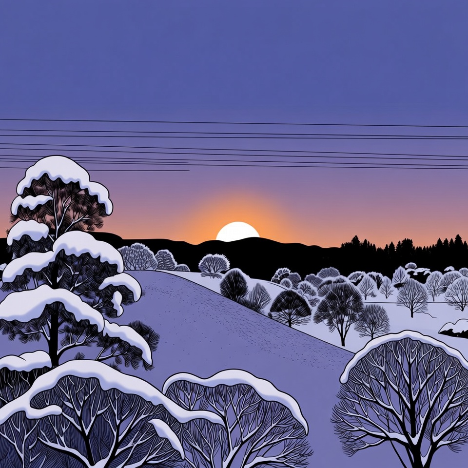 A line art illustration depicts a vibrant sunset with a large orange sun setting behind snow-covered hills and trees. Snowy trees with thick white branches frame the foreground against a purple twilight sky. Power lines stretch across the serene winter landscape.