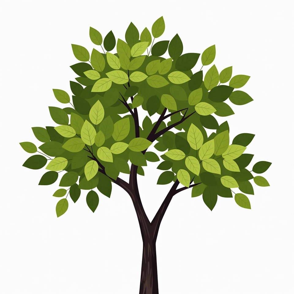 A vibrant green tree with numerous leaves is illustrated on a white background. The tree features a sturdy brown trunk that splits into two main branches. The leaves are detailed in various shades of green, creating a lush appearance.
