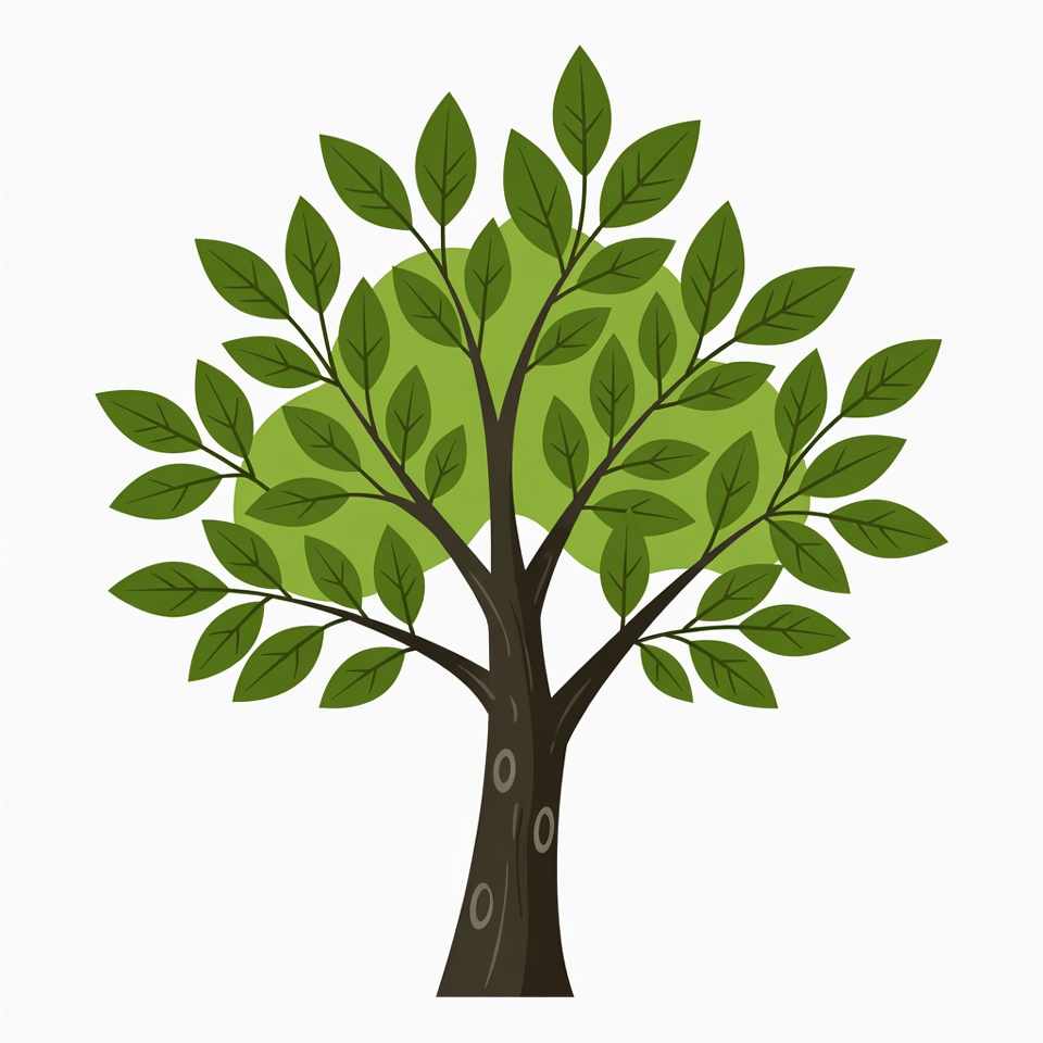 A vibrant green tree illustration features a thick brown trunk with textured bark and numerous lush green leaves forming a full canopy. The tree stands alone on a plain white background. The style is simple and cartoonish with smooth shading.