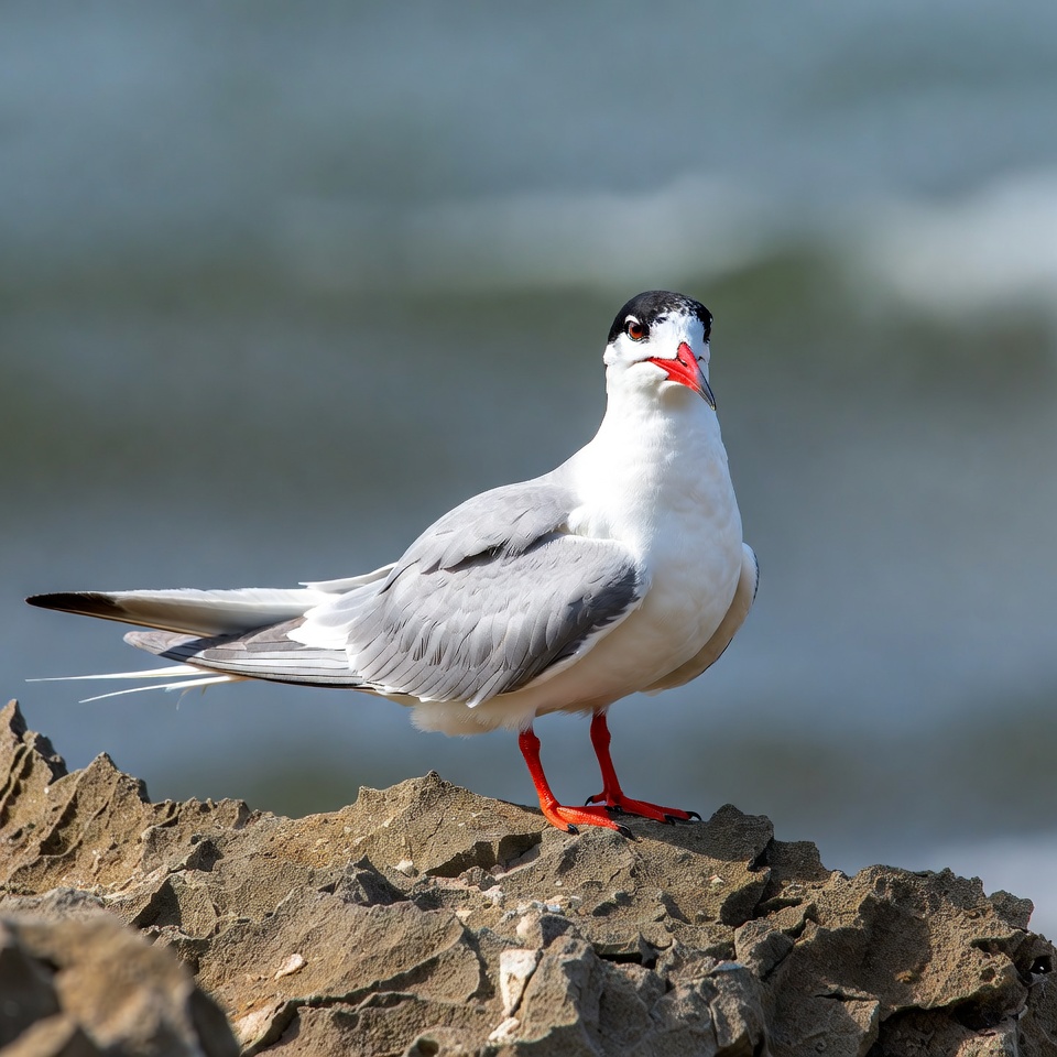 beach, bird, black cap, feathers, nature, ocean, red bill, red legs, rocks, rocky outcrop, sea bird, standing bird, water background, white bird, wildlife, wings spread, gull