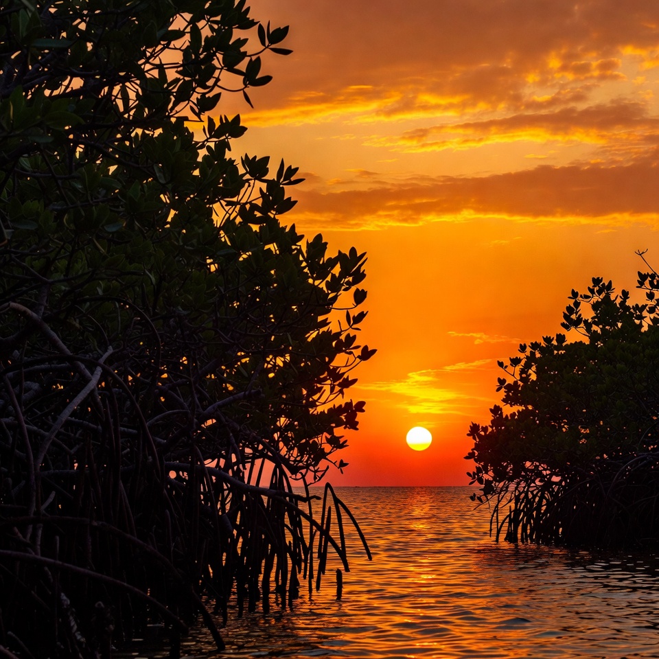 bay, clouds, coast, dusk, evening, foliage, golden hour, horizon, lagoon, landscape, mangroves, nature, ocean, orange, outdoors, peaceful, reflection, roots, scenery, seascape, serene, shoreline, silhouette, sky, trees, tropical, vibrant, water, sunset
