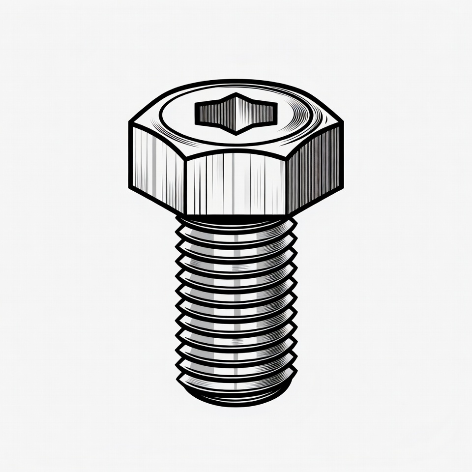 black and white, clipart, construction, engineering, fastener, hardware, hex bolt, hex head, illustration, isolated background, line art, machine bolt, metal bolt, screw, technical drawing, threaded bolt, bolt
