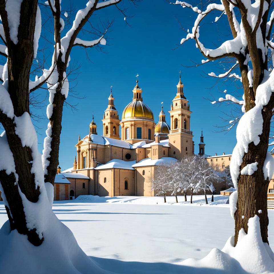 Snowy Golden-Domed Church Framed by Trees