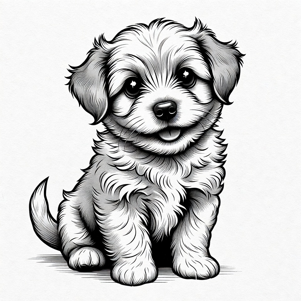 A detailed black and white illustration of a fluffy puppy sitting with its tongue out. The puppy has large expressive eyes, perky ears, and curly fur. It is depicted on a plain white background.