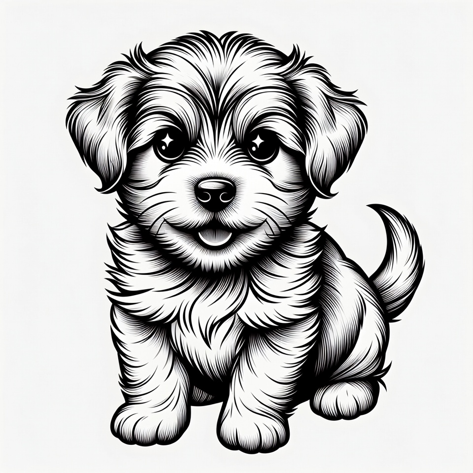 A detailed black and white line art illustration of a fluffy puppy sitting with its tail curled. The puppy has large sparkling eyes, a small black nose, and a happy open mouth showing its tongue. It features intricate fur textures and is isolated on a white background.