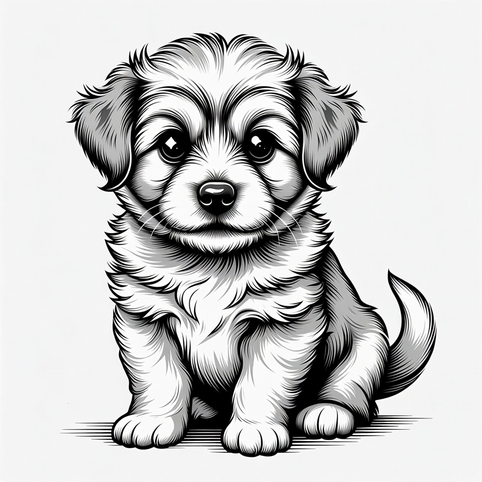 A detailed black and white sketch illustration of a fluffy puppy sitting with its paws forward. The puppy has large expressive eyes, perky ears, and a curly tail. It is depicted in a realistic ink drawing style on an isolated white background.