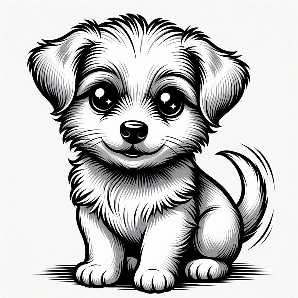 A detailed black and white line drawing of an adorable fluffy puppy sitting with its tail wagging. The puppy has large sparkling eyes, a smiling mouth, and perky ears. It is rendered in a realistic sketch style on an isolated white background.