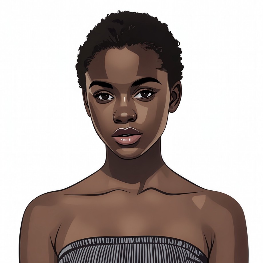 beautiful woman, black hair, brown eyes, dark skin, digital art, female, glossy lips, gray top, illustration, isolated background, portrait, short curly hair, shoulders, strapless top, striped top, tube top, woman, young woman, African-American woman