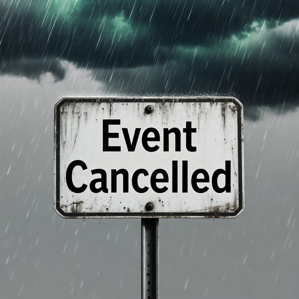 A weathered white road sign reading 'Event Cancelled' stands on a metal pole. Heavy rain pours down from dark, stormy green and gray clouds overhead. The sign shows signs of rust and wear against the dramatic rainy backdrop.