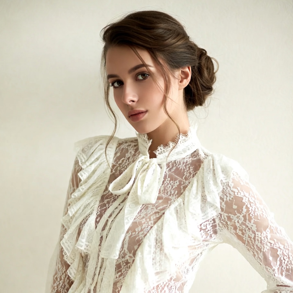 A young woman with long brown hair styled in an elegant updo poses confidently against a plain white background. She wears a sheer white lace blouse featuring ruffled shoulders, a large bow tie at the collar, and intricate lace patterns. Her expression is poised with subtle makeup and direct gaze.