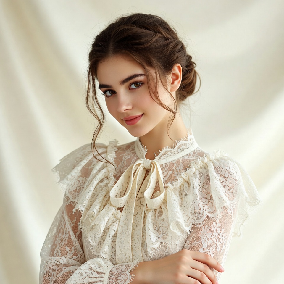 A young woman with long brown hair styled in an elegant updo gazes at the camera. She wears a delicate white lace blouse with ruffled shoulders and a large bow at the collar. She stands with arms crossed against a plain beige background.
