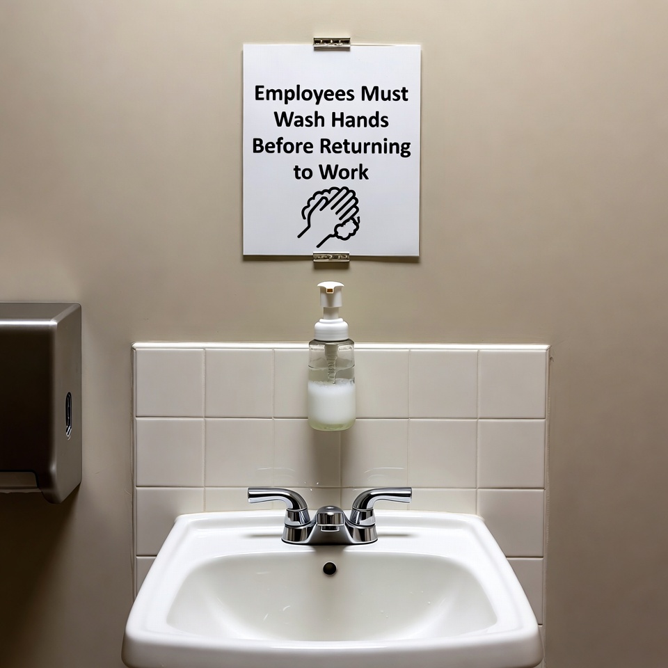 A white sign reading 'Employees Must Wash Hands Before Returning to Work' with a hand washing icon is mounted above a sink. The sink features a soap dispenser with white liquid soap and chrome faucets on a tiled wall. A paper towel dispenser is positioned nearby.