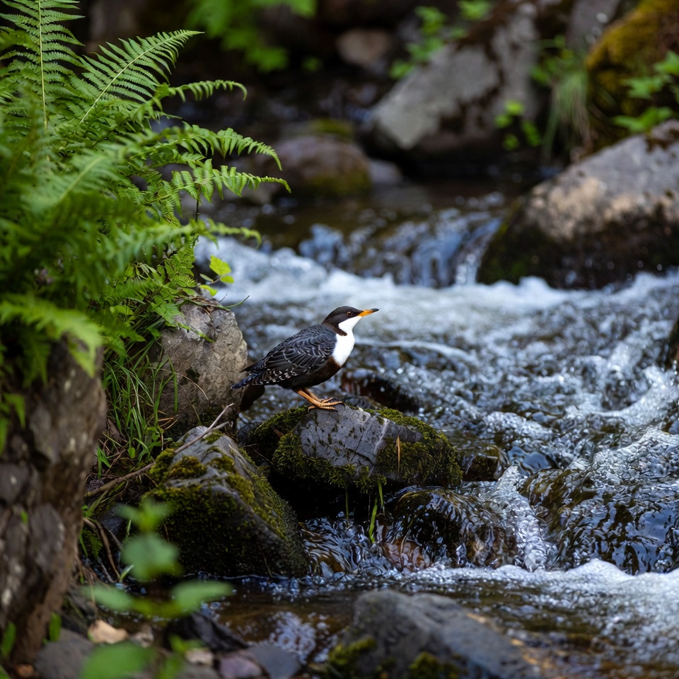 black and white bird, creek, dipper bird, ferns, flowing water, forest stream, green ferns, isolated background, moss, mossy rocks, nature, orange legs, outdoor, river bird, rocks, stones, stream, vegetation, water ouzel, wildlife, yellow chin, bird