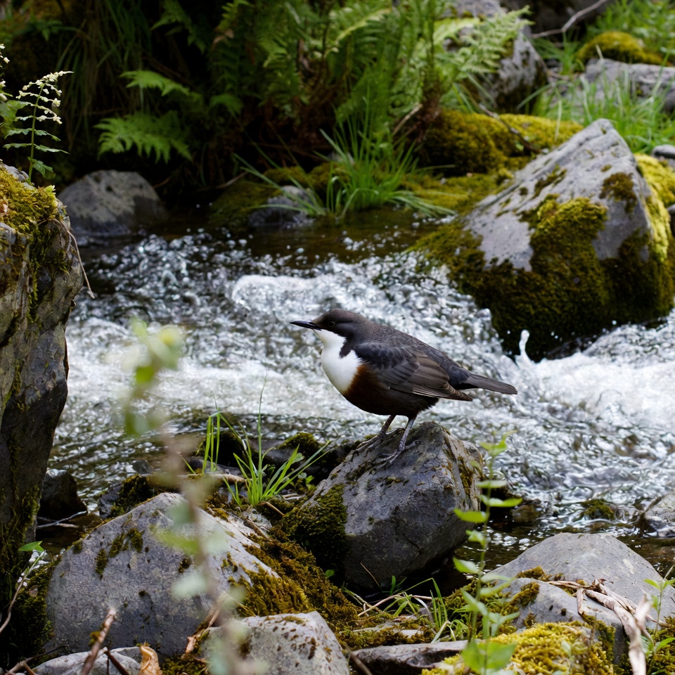 bird, feathers, ferns, flowing water, forest stream, gray bird, green vegetation, moss, mossy rock, natural habitat, nature, outdoor, river, riverbank, rocks, stream, water, white belly, wildlife, dipper bird