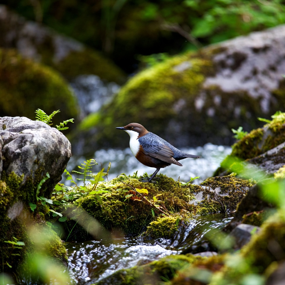 Dipper bird on mossy rock by stream