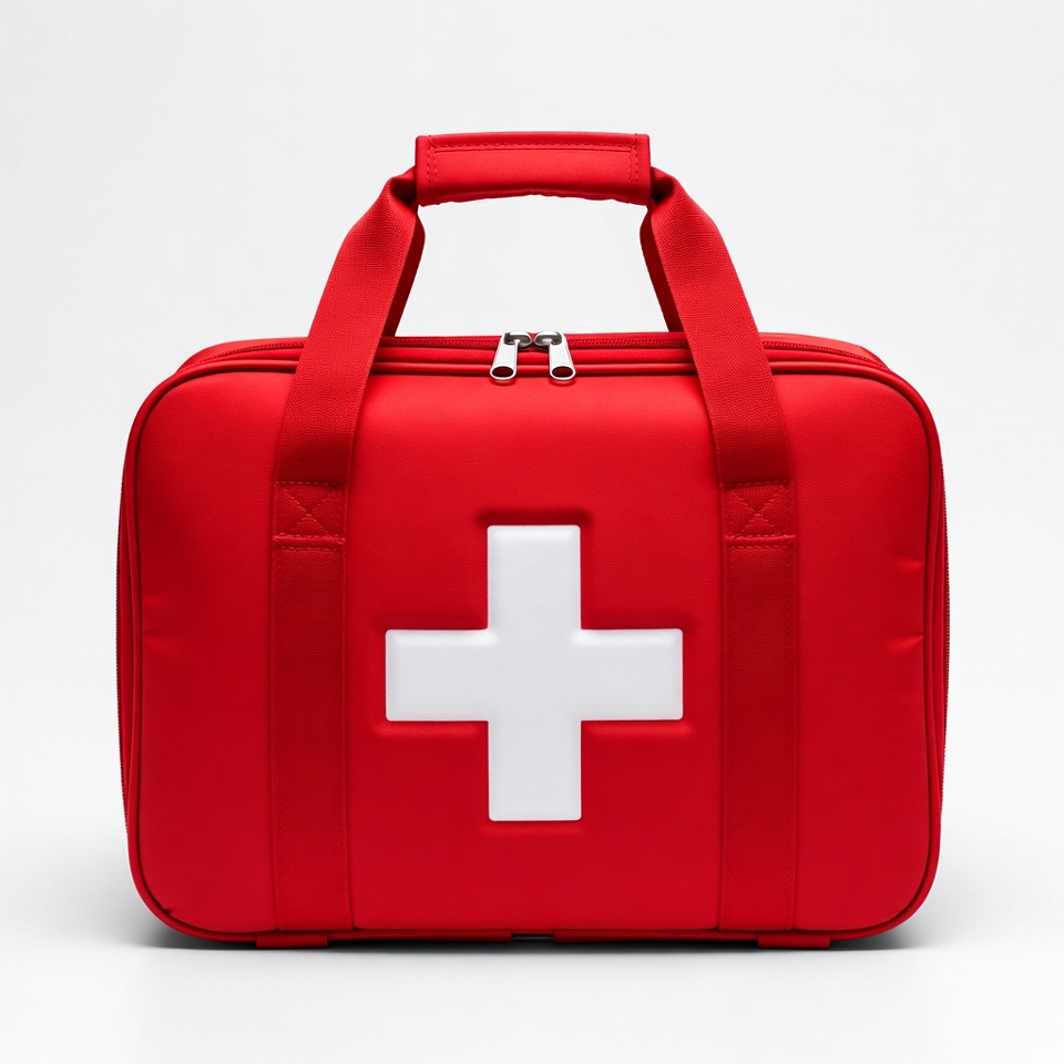 aid bag, cross, emergency, emergency bag, first aid, health, health kit, isolated background, medical bag, medical kit, padded case, red, red bag, rescue, rescue bag, white cross, zipper handles, first aid kit