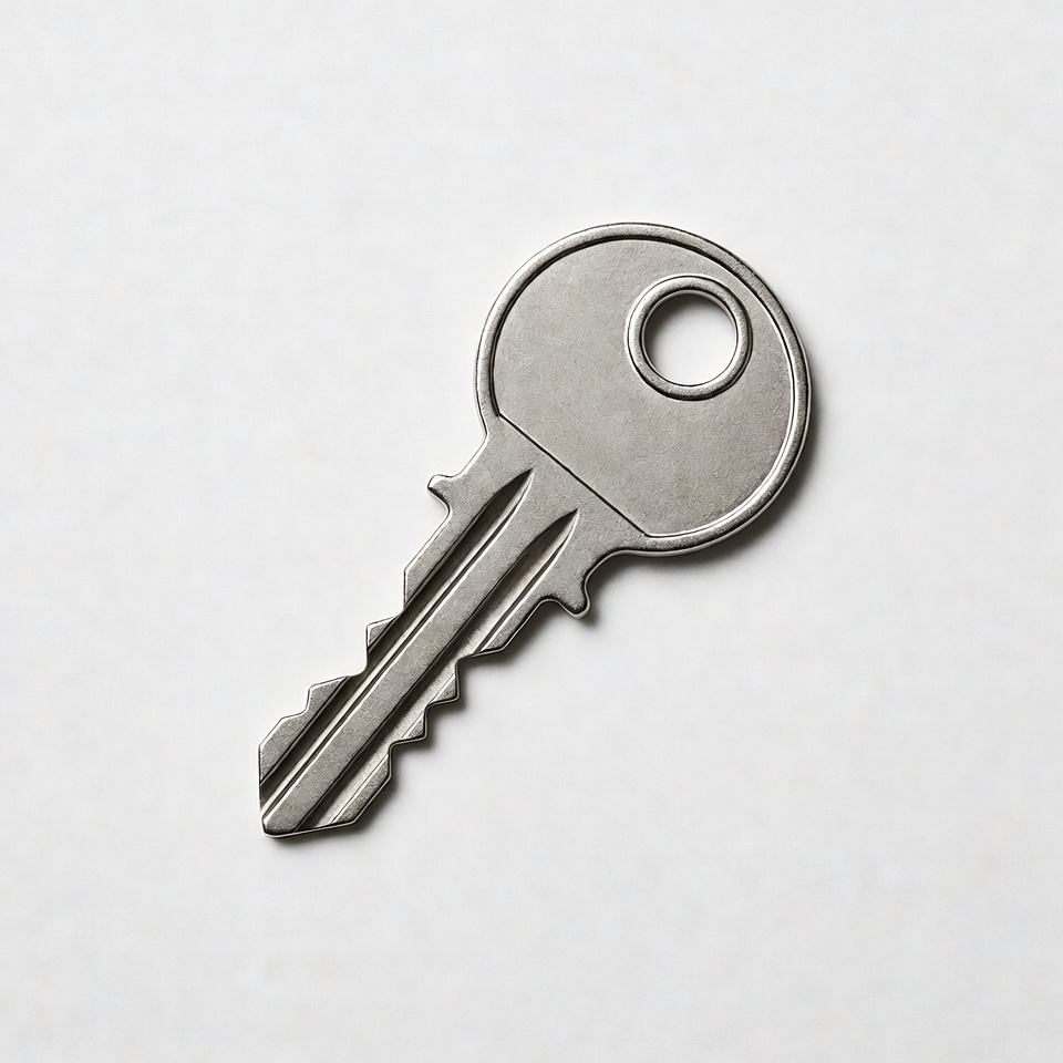 door key, house key, isolated, jagged teeth, keyring hole, lock key, metal key, round bow, shiny, silver key, white background, key