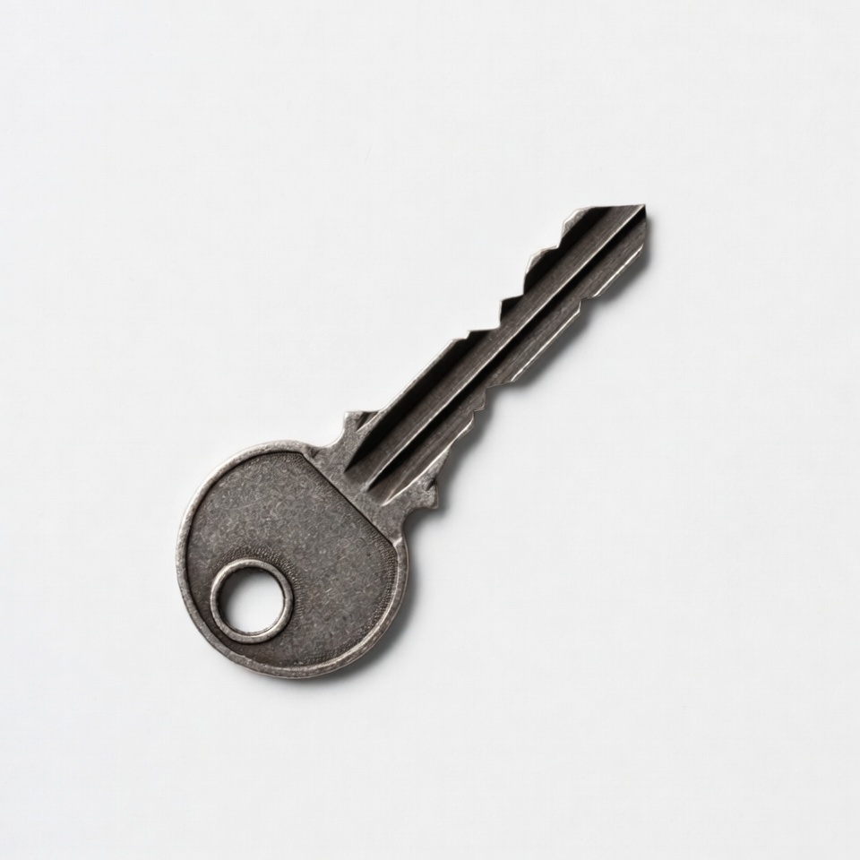 A single antique-style metal key with a round bow and intricate teeth lies diagonally on a white background. The key has a grayish finish and a small hole in the bow. It is centered and isolated with no other objects visible.
