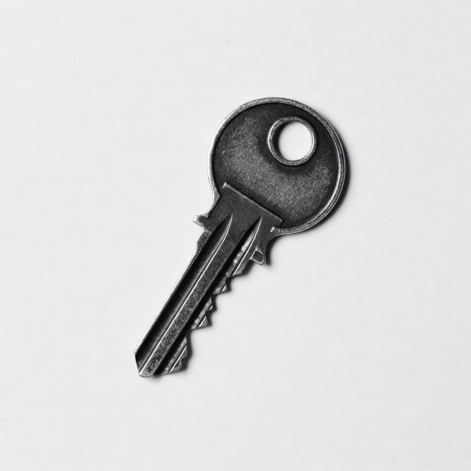 A single black metal key with a round head and jagged teeth lies on a plain white background. The key features a circular hole in the head and a textured surface. It is positioned diagonally for a clear view.