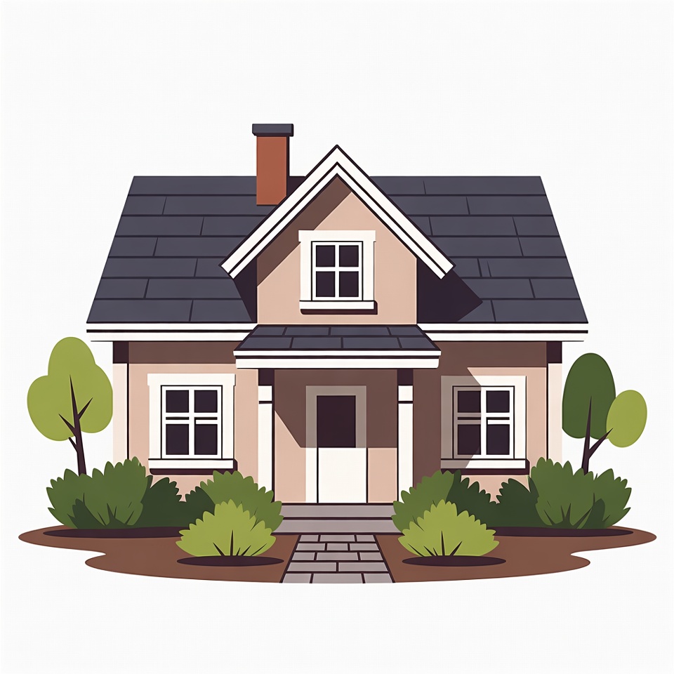 A colorful cartoon illustration of a two-story house with beige siding, dark gray roof, and a brick chimney. It features white-framed windows, a front door under a small porch, and a stone pathway leading to the entrance. Green trees and bushes surround the house on a white background.