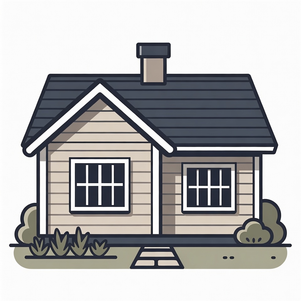 A simple line art illustration of a beige house with a dark gray sloped roof and chimney. It features two front windows, shrubs on both sides, and grass with steps at the base. The house is depicted on an isolated white background.