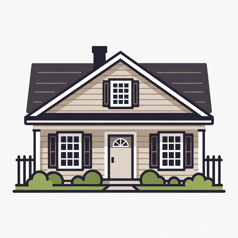 A simple line art illustration of a two-story house features beige siding, a dark sloped roof, and a brick chimney. White shuttered windows frame the front door with a fanlight above, surrounded by green shrubs and a white picket fence. The house stands isolated on a plain white background.