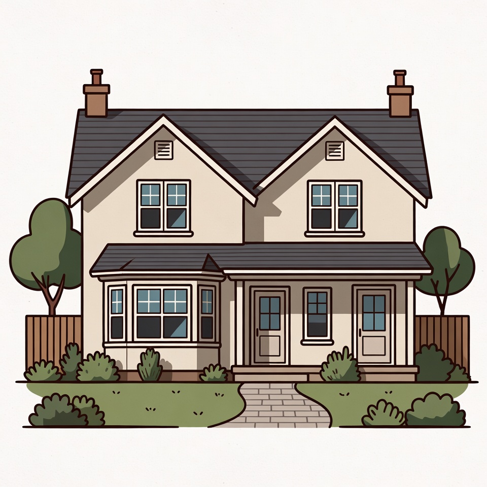 A charming two-story house with beige siding and dark gray roof is depicted in a flat illustration style. It features multiple windows, a front porch with double doors, and a stone pathway leading to the entrance. Flanking trees and shrubs surround the house on a grassy lawn with a wooden fence.