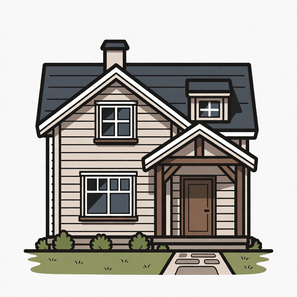 A simple line art illustration of a two-story house features light beige siding, dark blue roof, and white-framed windows. A wooden porch with a brown door sits in front, flanked by green shrubs and a stone path. A chimney tops the roof, and the house stands on a grassy base with an isolated white background.