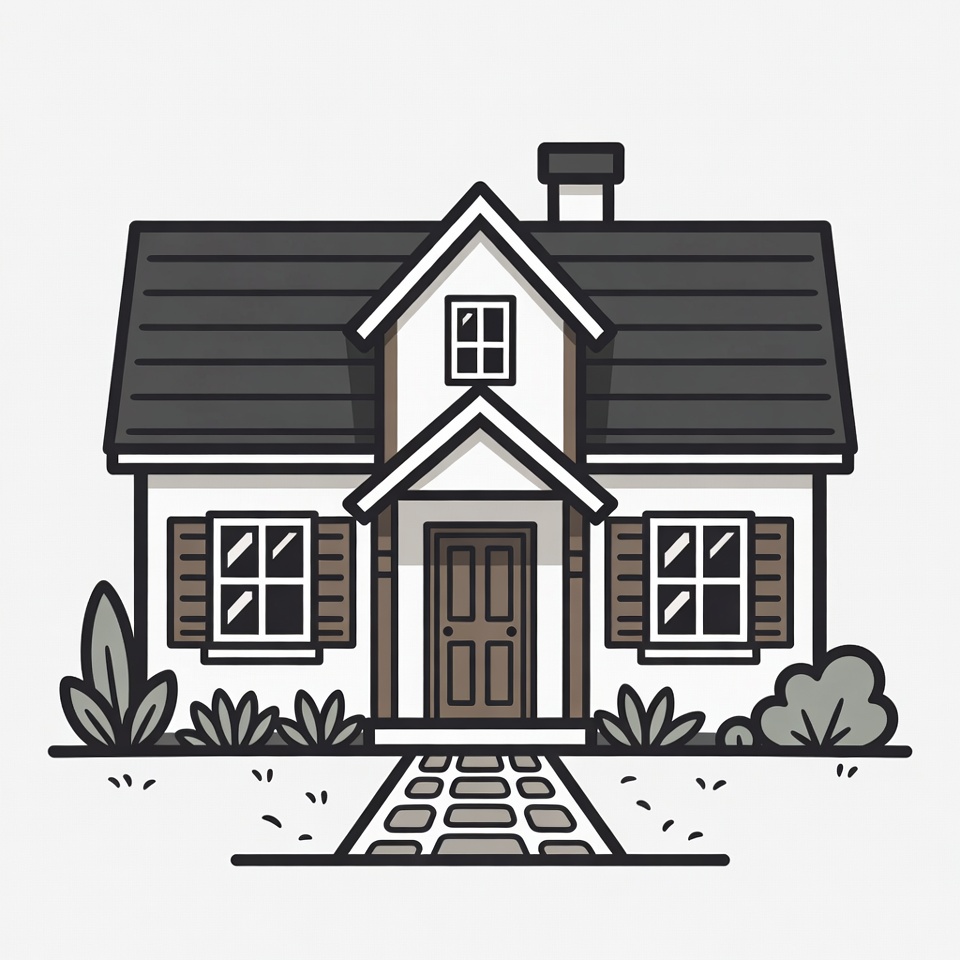 A line art illustration of a cozy two-story house features white siding, dark shingled roof, and a brick chimney. Brown shutters frame the windows, and a brown front door sits under a small porch. Potted plants and a stone pathway lead to the entrance on an isolated white background.