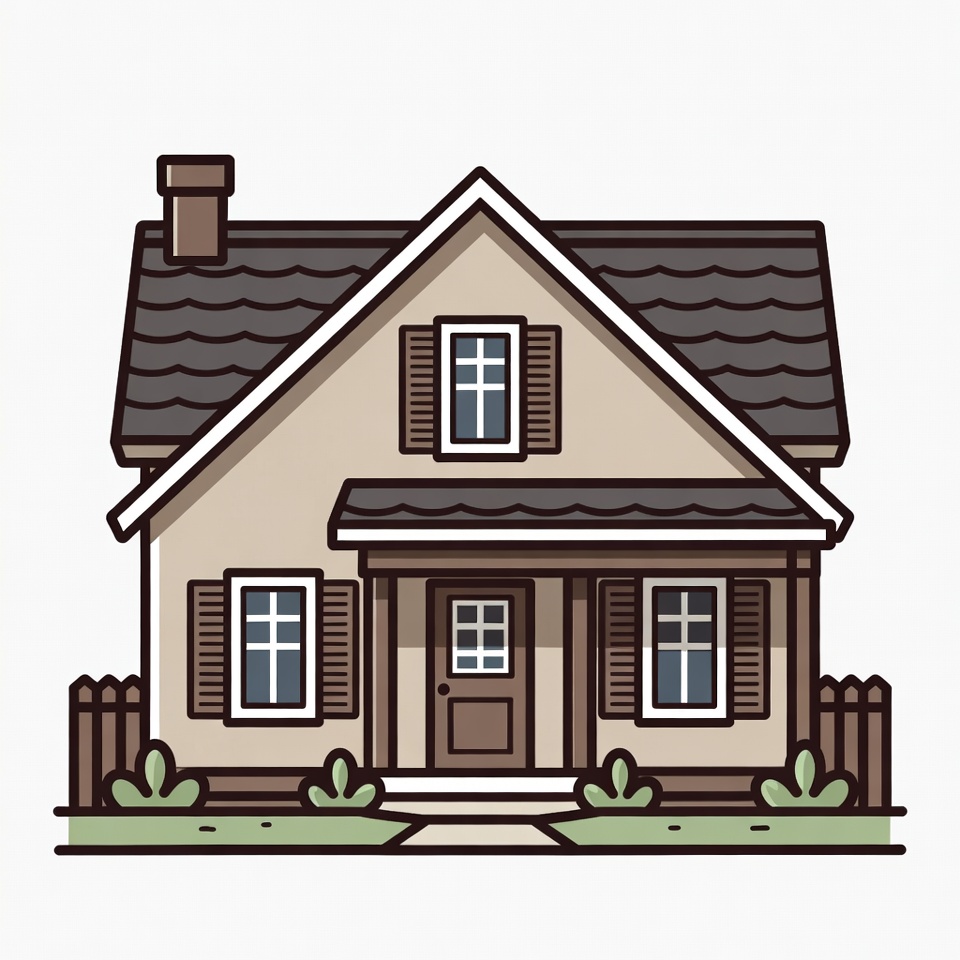 A simple line-drawn illustration of a beige house with a dark shingled roof and brick chimney. It features blue shutters on the windows, a brown front door under a small porch, and green bushes on either side. A short wooden picket fence frames the front of the house on an isolated white background.
