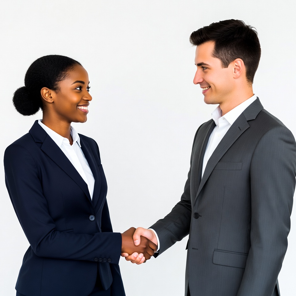 A smiling African-American woman in a navy blue blazer and white blouse shakes hands with a smiling Caucasian man in a gray suit and white shirt. Both stand facing each other on a plain white background. They appear professional and engaged in a business greeting.