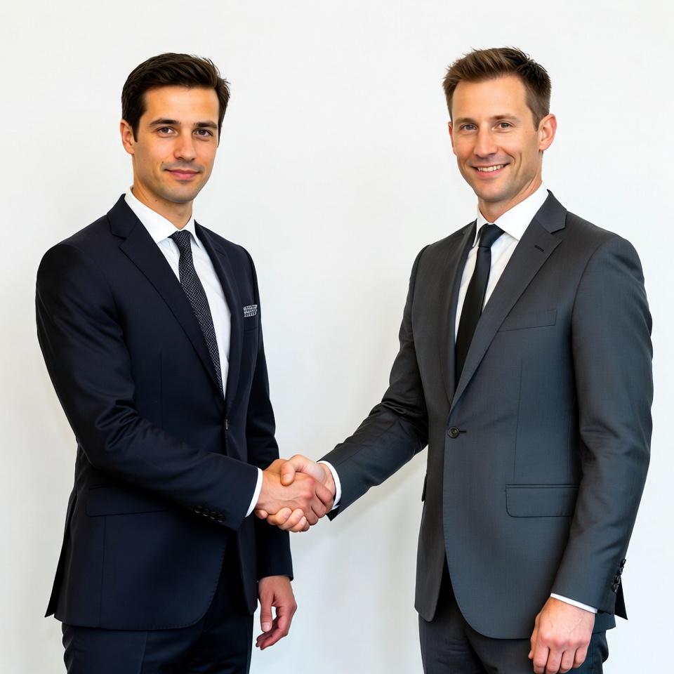 Two men in dark suits and ties shake hands firmly against a plain white background. Both have short brown hair and smile professionally. They stand facing each other in formal business attire.