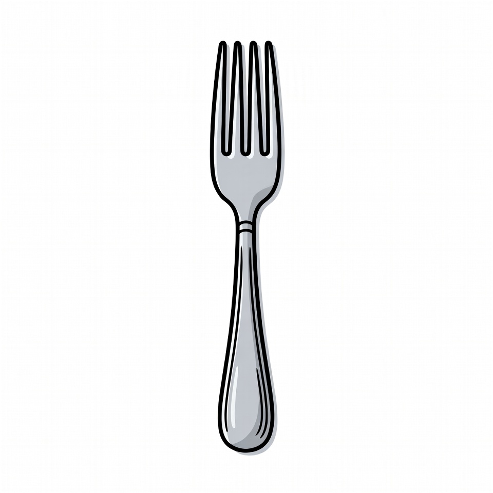 A simple line drawing of a silver fork with four tines and a slender handle. The illustration features clean black outlines on a white isolated background. It has a hand-drawn style with subtle shading.