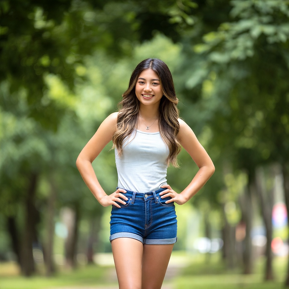 A young Asian woman with long wavy dark hair smiles confidently while standing on a park path. She wears a gray tank top and high-waisted denim shorts, with hands on her hips. Lush green trees and grass form a blurred background.