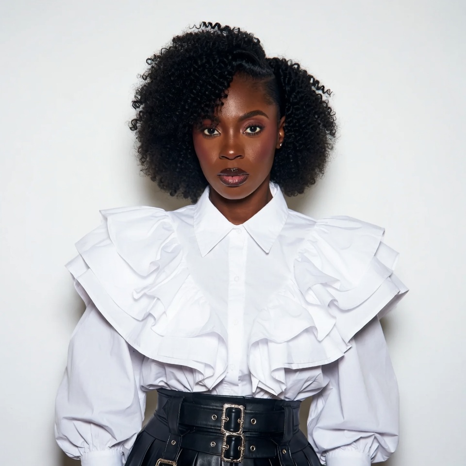 A young African-American woman with voluminous curly hair stands against a white background. She wears a white collared blouse with exaggerated ruffled shoulders and puffed sleeves, cinched with a black leather belt featuring silver buckles. Her expression is confident with subtle makeup accentuating her features.