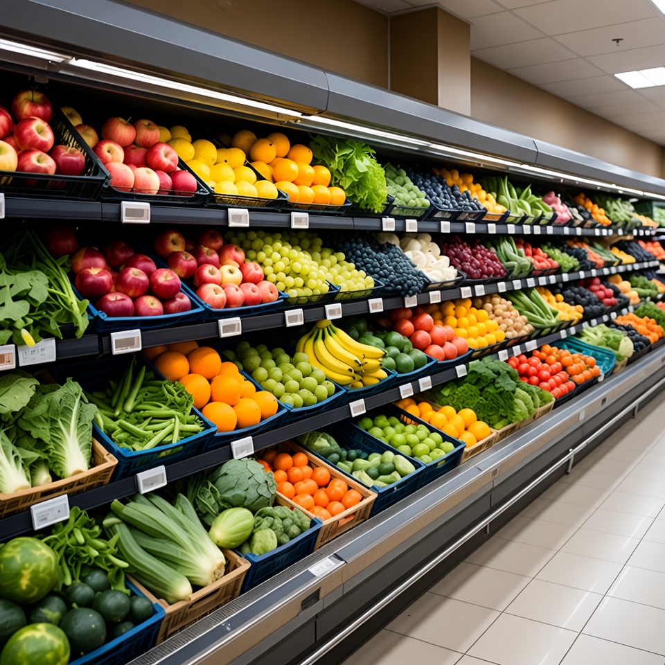 apples, bananas, berries, broccoli, citrus fruits, food display, fresh produce, fruits, grapes, green vegetables, greens, grocery store, isolated background, lettuce, oranges, peppers, produce aisle, red apples, shelves, tomatoes, vegetables, supermarket
