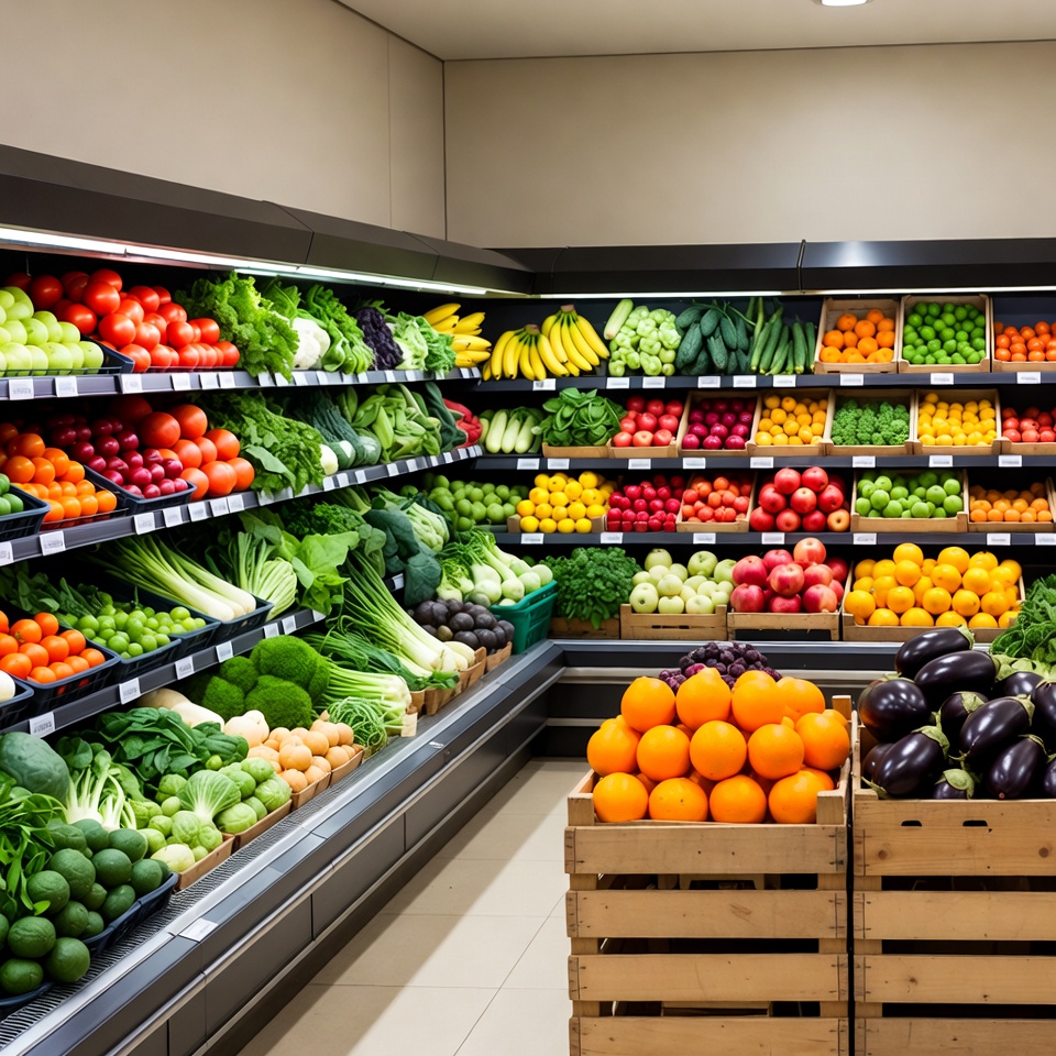 A well-stocked grocery store aisle features shelves filled with fresh vegetables and fruits. Vibrant displays include tomatoes, lettuce, bananas, oranges, eggplants, and broccoli in crates and on racks. The modern supermarket section has bright lighting and organized produce sections.