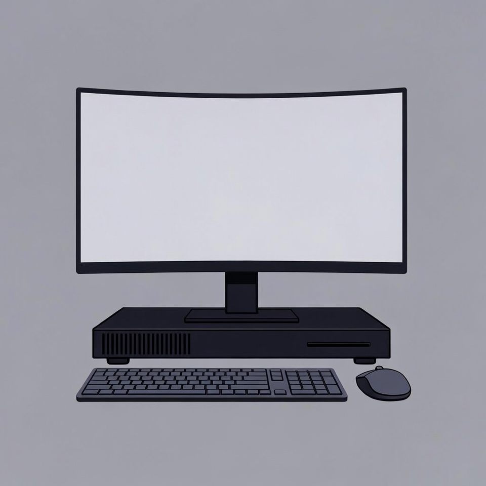 PC setup, black monitor, blank screen, clipart, computer desk setup, computer hardware, computer monitor, computer mouse, desktop computer, gaming monitor, illustration, isolated background, keyboard, monitor stand, office equipment, ultrawide monitor, curved monitor