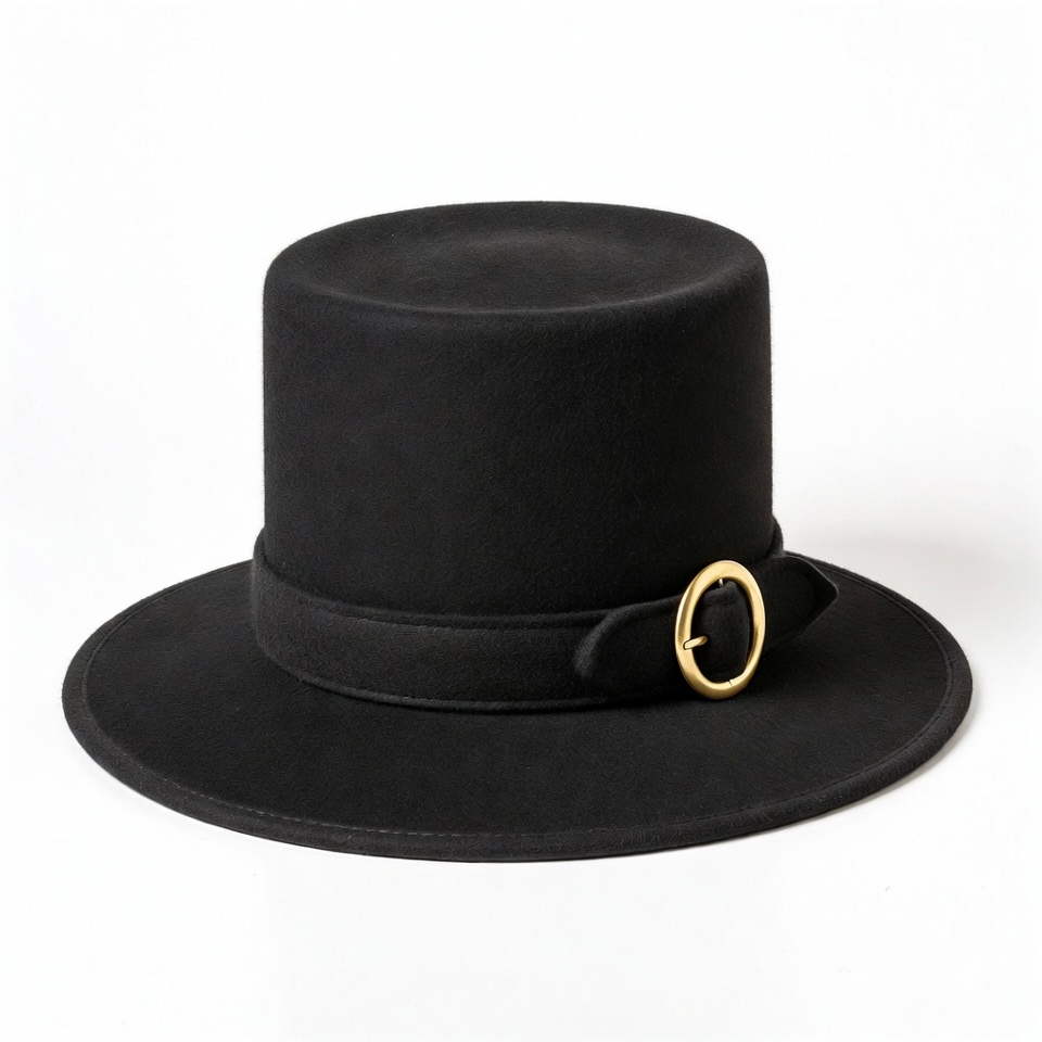 black, black hat, fashion, fashion accessory, felt hat, gold, gold buckle, hat, isolated background, leather band, tall crown, western hat, wide brim hat, cowboy hat