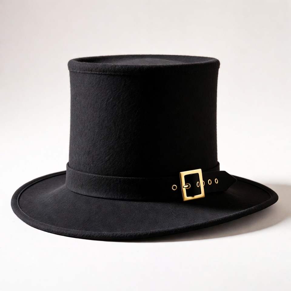 A black felt top hat features a wide brim and tall crown. It is accented by a black leather band with a gold rectangular buckle. The hat is displayed against a plain white background.