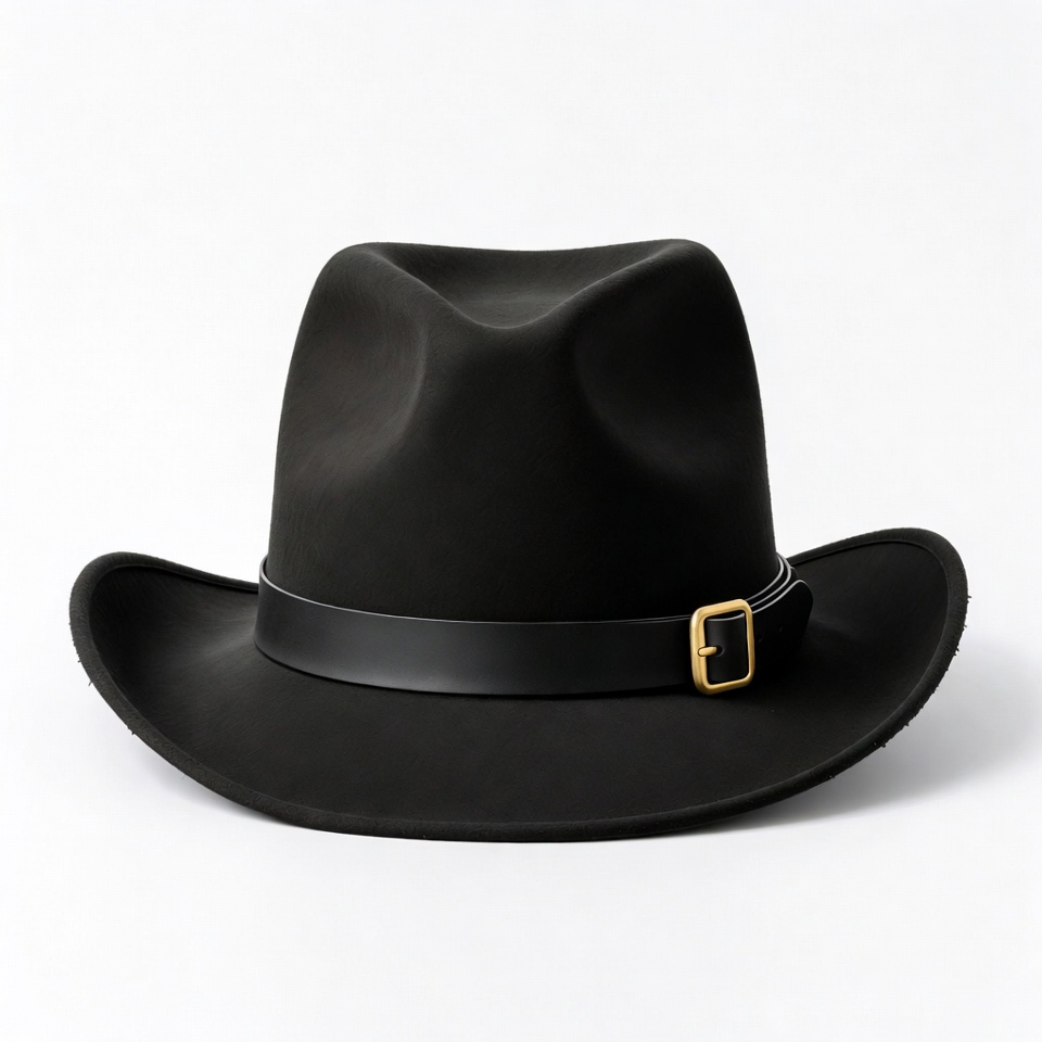 black, black hat, fashion accessory, fedora hat, felt hat, gold buckle, hat, isolated background, leather hatband, western hat, wide brim hat, cowboy hat