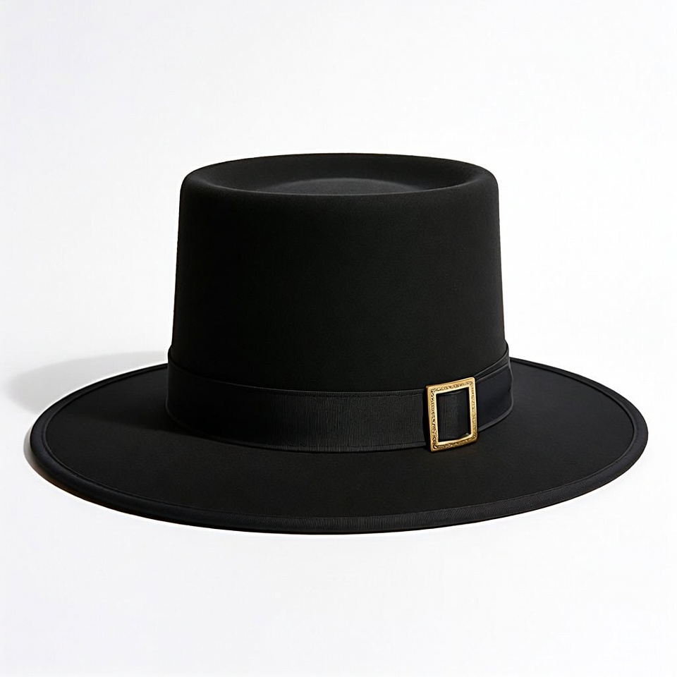 black felt, black hat, fashion accessory, felt hat, gold buckle, hat band, isolated background, mens hat, rectangular buckle, satin ribbon, tall crown hat, unisex hat, western hat, wide brim hat, cowboy hat