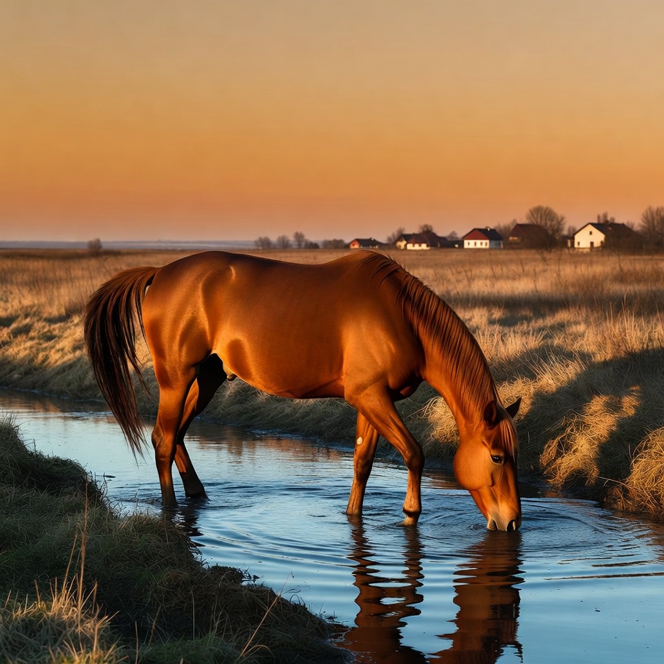 animal, brown horse, countryside, drinking water, dusk, equine, farmhouses, field, golden hour, grass, grazing, isolated background, mare, meadow, nature, outdoors, reflection, rural landscape, shallow water, stream, sunset, warm light, horse